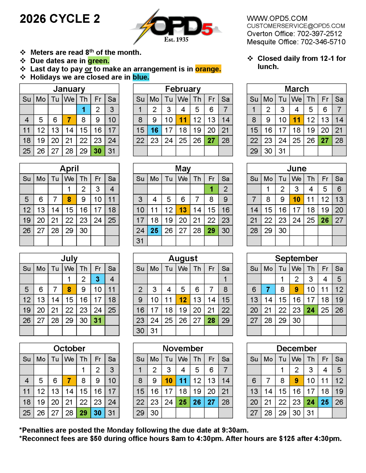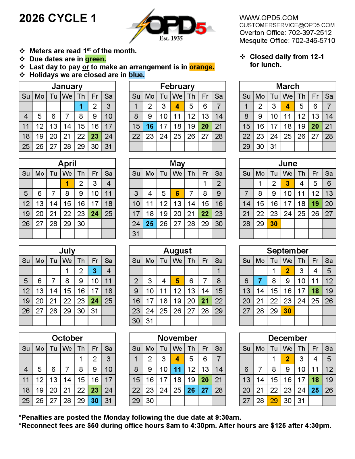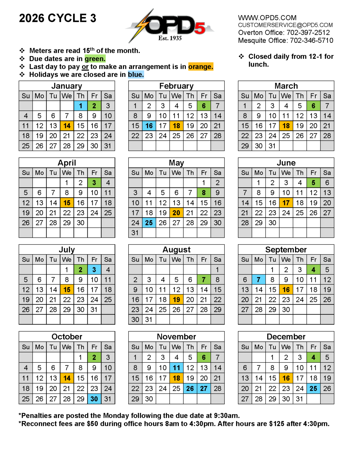 • Monthly billing and due date schedules are available below. Please note: Bills are subject to a late fee if payments are not made by 5 p.m. on the due date.