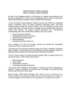 A member of the OPD5 Board of Directors recently received his Board Leadership Certificate (BLC) from the National Rural Electric Cooperative Association (NRECA) for completing a rigorous director’s training program.