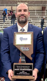 Aaron Walker holds the 2025 State Championship trophy won last year by the MVHS Wrestling team where he serves on the coaching staff.
