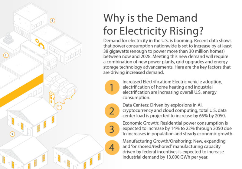 Data centers are another major contributor to rising demand. These facilities require huge amounts of power to operate servers and cooling systems 24/7. Tech companies are building new facilities nationwide––many of which are in rural areas served by small utilities.